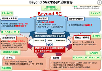 6Gは、5Gの高速・大容量、低遅延、多数接続の各性能の向上に加え、高速・大容量や低遅延などの各要求条件を同時に実現する「複数要求条件の同時実現」、100GHzを超えるサブテラヘルツ帯などの「新たな高周波数帯の開拓」、「空・海・宇宙などへの通信エリアの拡大」、「超低消費電力・低コストの通信実現」などに向けて研究開発が進められている次世代の移動通信方式。