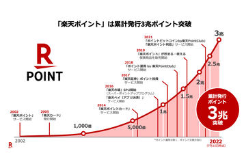 7月には、ポイントプログラム「楽天ポイント」の累計発行ポイント数が3兆ポイントを突破。2002年のサービス開始以来、累計発行ポイント数は順調に推移している。