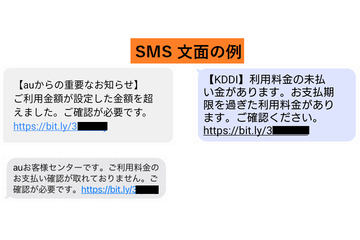 これまでに確認されているフィッシング詐欺のSMSでは、料金の未納を装い「auお客様センターです。ご利用料金のお支払い確認が取れておりません」としたものや「お支払い期限を過ぎた利用料金があります」などとする文面に、リンクが添えられているのが典型的パターンだ。