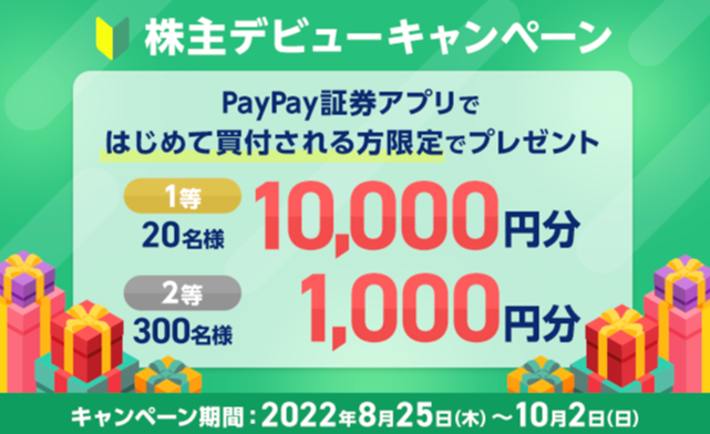 ニュースPayPay証券、最大1万円が当たる「株主デビューキャンペーン」 大矢 励2022年8月26日 06:00 PayPay証券は、「株主デビューキャンペーン」を開始した。期間は10月2日まで。 期間中、はじめて日米株を合計1万円以上、都度取引した人の中から抽選で1等20人に1万円、2等300人に1000円の投資資金がプレゼントされる。 PayPay証券アプリまたはパソコン向けの取引サイトでの日米株取引が対象。投資信託、CFDは対象外となっている。 既にPayPay証券ミニアプリで口座開設、取引をしている人も対象であるが、PayPay証券ミニアプリ内での取引は本キャンペーン対象外。