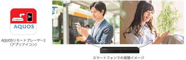 「AQUOSリモートプレーヤー2」をスマートフォンやタブレットなどの端末にインストールすることで、録画した番組やレコーダーのチューナーで受信中の番組を、端末上でストリーミング視聴できるようになる。また、Wi-Fiダビング機能により、スマートフォンにあらかじめ録画番組をダウンロードしておけば、インターネットに接続できない場所でも視聴できる。