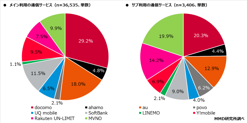 18歳~69歳の男女4万人のうち、通信契約しているスマートフォンを所有している3万6535人を対象に、メインで利用しているスマートフォンの通信サービスを調査したところ、NTTドコモが29.2%、ahamoが4.8%、auが18.0%、povoが2.1%、UQ mobileが6.5%、ソフトバンクが11.5%、LINEMOが1.1%、ワイモバイル(Y!mobile)が9.5%、楽天モバイルが7.5%を占める結果となった。