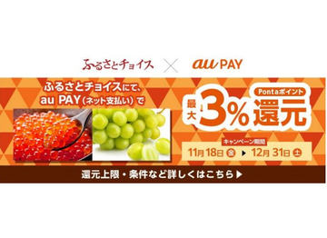 12月31日までの期間中、「ふるさとチョイス」で「au PAY(ネット支払い)」を利用して1回1万円以上支払うと、1回の支払いごとにPontaポイントが最大3%還元される。