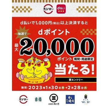 2月28日までのキャンペーン期間中にエントリーし、スシローなどの対象店舗で期間中合計1000円以上を「d払い」で決済すると、dポイントが当たる抽選の対象となる。