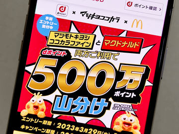 5月7日までの期間中、エントリーの上、マクドナルド(モバイルオーダーやマックデリバリーも対象)とマツモトキヨシ/ココカラファイングループで、dポイントカードを提示して1ポイント以上積算/使用すると山分け対象になる。