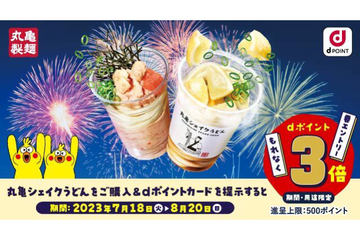8月20日までの期間中、丸亀製麺で店頭での持ち帰りまたはモバイルオーダーで対象商品「丸亀シェイクうどん」を注文すると、通常還元に加え2倍の期間・用途限定ポイントが進呈される。特典分の還元上限は、期間合計500ポイントまで。