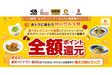 9月30日までの期間中、くら寿司や吉野家、ミスタードーナツなどの対象店舗で楽天ポイントカードを提示し1ポイント以上獲得すると抽選を実施。抽選で100人に、期間中の対象会計の合計の100%分がポイント還元される。