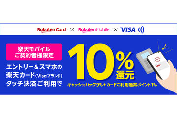 3月31日までの期間中、楽天モバイルのRakuten最強プランを契約中のユーザーが、楽天カード(Visa)をスマートフォンのタッチ決済で利用すると、通常の1%還元に加え9%分がキャッシュバックで還元される。