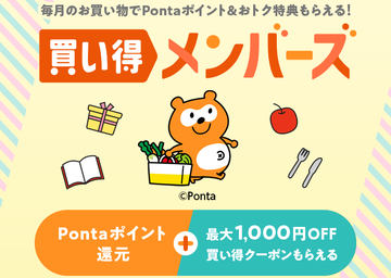 「買い得メンバーズ」は、当月1日10時~翌月1日9時59分までの購入状況や支払い方法に応じて、Pontaポイントの還元やクーポン配布が受けられる特典制度。