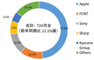 メーカー別の出荷台数では、アップル(Apple)が1位、シャープが2位、グーグル(Google)が3位となった。シャオミ(Xiaomi)とサムスンがともに4位に入っている。