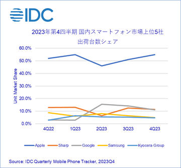 グーグルの出荷台数は58万台(前年同期比47.7%減)で、シェアは8.5%。IDC Japanでは、出荷を大幅に減らす結果になったが、60万台弱という数字は決して低くないとしている。