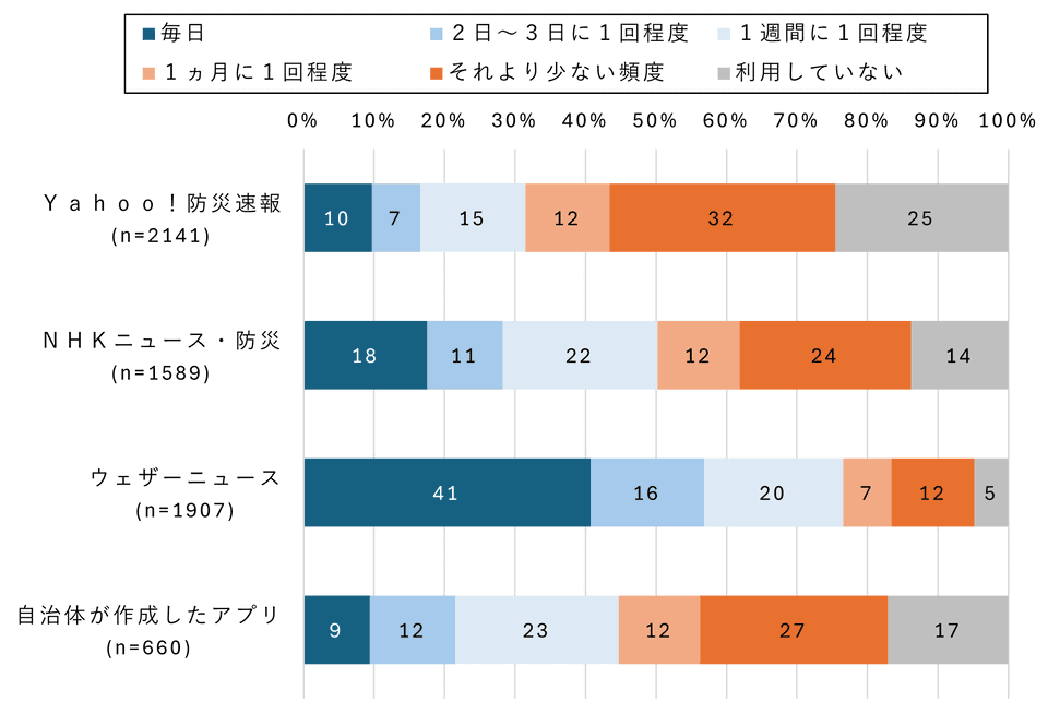 特に「NHKニュース・防災」や「自治体が作成しているアプリ」は、年代が上がるにつれて災害時の利用率が高くなる傾向が見られたという。
