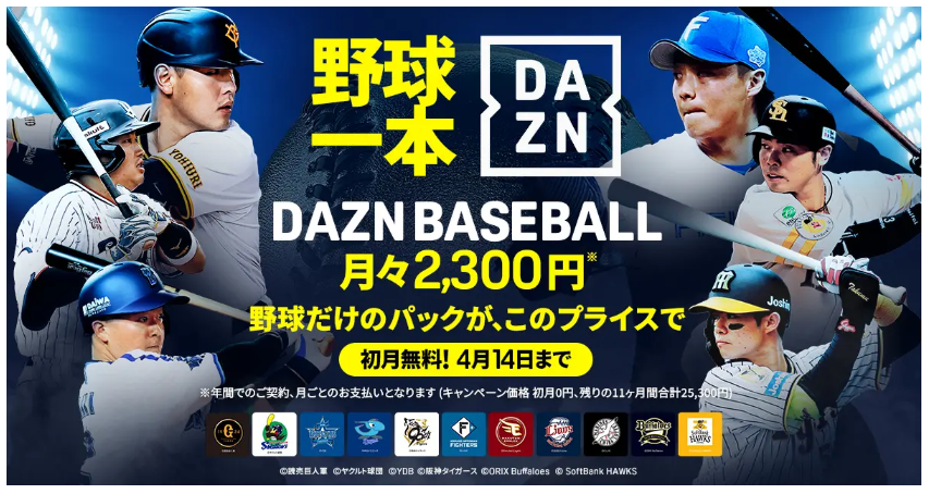 また、4月14日までに「DAZN BASEBALL」プランに入会加入すると「DAZN BASEBALL」初月無料になるキャンペーンが実施されている。