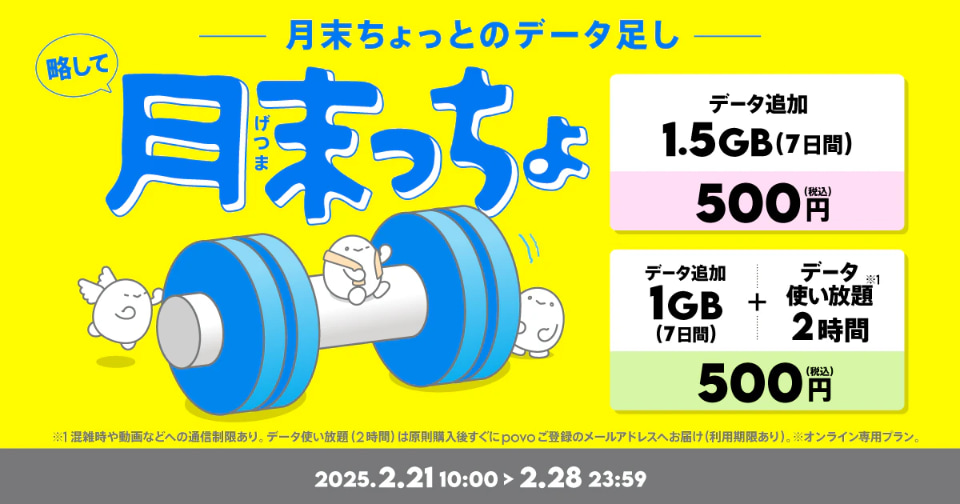 KDDIと沖縄セルラーは、オンライン専用料金ブランド「povo2.0」で、月末の"ギガ不足”に向けたトッピング「月末っちょ(げつまっちょ)」の提供を開始した。