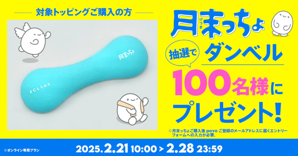 また、「月末っちょ」提供開始を記念し、「月末っちょ」トッピングを購入したユーザーの中から抽選で100名にpovoのオリジナルダンベル「月末っちょダンベル」がプレゼントされるキャンペーンを実施する。