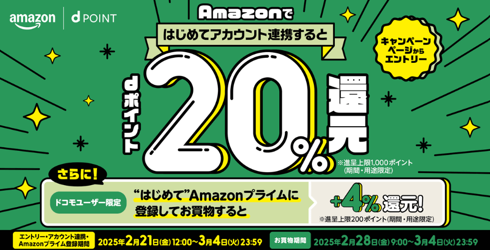 ニュースAmazonでの買い物で「dポイント」20%還元キャンペーン、本日4日まで 間島 知優2025年3月4日 00:01 NTTドコモのdアカウントとAmazonアカウントを連携して買い物をすると、dポイントが還元される「Amazon 新生活のお買物でdポイント20%還元キャンペーン」が、本日3月4日で終了する。 期間中、はじめて「dアカウント」と「Amazon アカウント」を連携し、「Amazon.co.jp」で買い物すると、購入金額の20%分のdポイント(期間・用途限定)が付与される。進呈上限は1000ポイントまで。買い物前に、キャンペーンサイトからエントリーをする必要がある。 Amazon プライム登録する