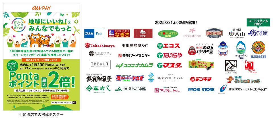 対象加盟店にて、au PAYを利用して200円以上支払うと、1回の支払いごとに、ベースポイントの最大2倍のPontaポイント(2ポイント/200円)を還元する。還元額の上限は、月に500ポイントまでで、利用月にau PAY グリーンライフ・ポイント専用ページからのエントリーが必要となる。