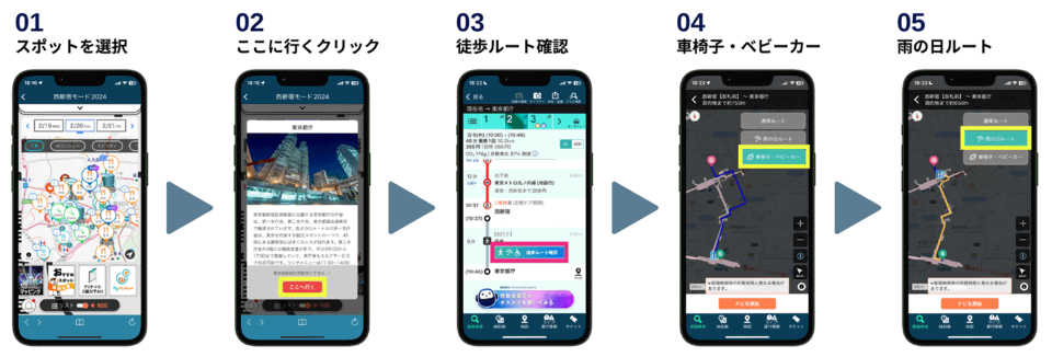 「AIコンシェルジュ」機能は、チャットを通じて、そのユーザーの趣向に合わせた西新宿エリア内のスポットを提案する機能。たとえば、ユーザーが「車椅子」や「ベビーカー使用」を選択している場合に西新宿エリア内の目的地を検索すると、徒歩ルートも「車椅子・ベビーカールート」を優先して案内される。
