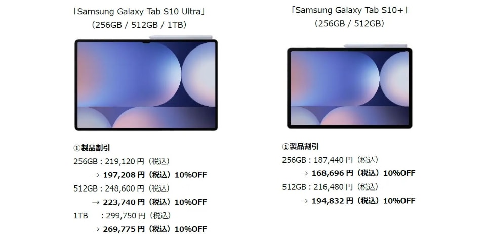 | Galaxy Tab S10 Ultra(1TB) | 29万9750円 | 26万9775円 |