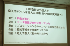 楽天モバイルのユーザー層は主に、楽天グループサービスのユーザーが多くを占める。幅広い世代から乗り換え先としても注目を集める一方で、在留外国人からも支持を増やしている。楽天モバイルショップにおける全契約数のうち、およそ25%を外国籍のユーザーが占めるという。紹介キャンペーンを活用しての契約が多く、料金の安さなども在留外国人からは魅力に写っているという。