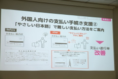 日本人ユーザーと同じように支払い案内状(督促状)を送付することになるが、外国人向けには文面をより平易にしたり、イラストを交えたりとシンプルにした。楽天モバイル マーケティング企画部 シニアマネージャーの勝間田優氏によれば、これにより支払遂行率に大きく改善が見られたという。支払いに関連するEメールなどでも「やさしい日本語」を使った案内を進める。