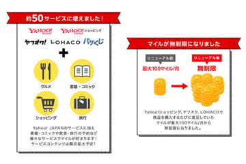 現在、ブロンズランク認定の条件とされるマイルは80~199マイルだが、改定後は50~199マイルに変更される。サービスへの訪問で貯まるマイル数は、スマホ版Yahoo! JAPANのトップページへのログイン含めてすべて1日1マイルになる。マイル獲得による特典に現在のデータ通信容量のほか、クーポンなどが新たに加わる。