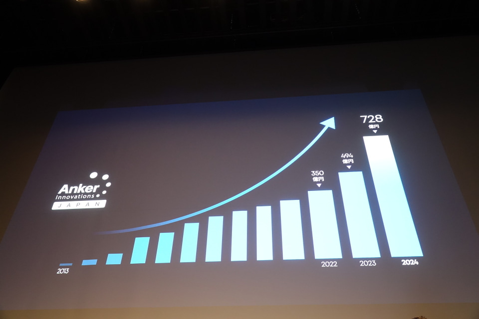発表会に登壇した、アンカー・ジャパン 代表取締役CEOの猿渡歩氏は、その好調ぶりについて話した。同社は2013年に創業。直近3年で着実に売上を伸ばしつつある。2022年に350億円だった売上は、2023年には494億円に達した。その後2024年には728億円と前年比で47%ほども成長している。
