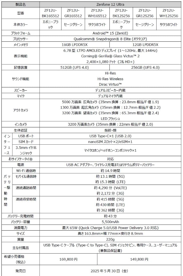 ASUS JAPANは28日、SIMフリースマートフォン「Zenfone 12 Ultra」を5月30日に発売すると発表した。価格は14万9800円~。