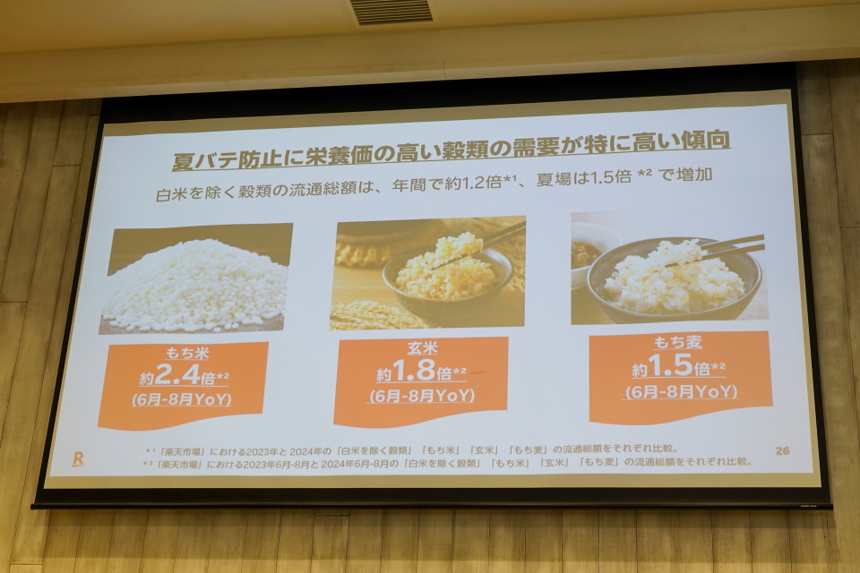 食のトレンドとしては「主食のバラエティ化」が挙げられた。玄米やもち米など白米以外の穀物類の流通は、昨年1年間で約1.2倍に増加。特にコロナ禍以降の健康志向の高まりで雑穀米の利用が増えている。昨年夏は通年の伸び率(1.2倍)を上回り、夏場だけで1.5倍伸びた。夏バテ対策にも良いとされるもち米(約2.4倍増)、玄米(約1.8倍増)、もち麦(約1.5倍増)などが特に人気だとしている。