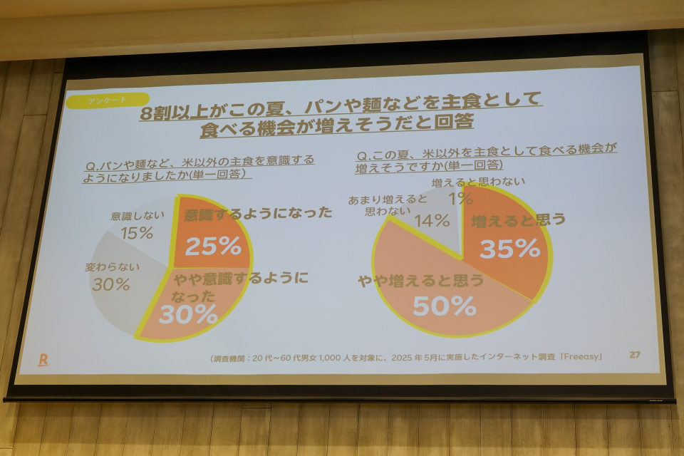アンケート調査では、パンや麺類以外で米以外の主食を意識するようになったかという問いに、半数以上が「意識するようになった」と回答。この夏に米以外の主食を食べる機会が増えそうかという問いにも、約8割以上が「増えると思う」「やや増えると思う」と答えた。一方で「意識しない」「変わらない」と回答した方も全体の約45%おり、主食に関するユーザーニーズが二極化していると分析されている。