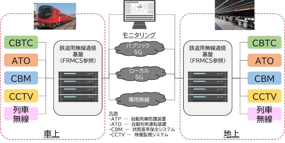 5Gの公衆ネットワークとローカルネットワークを利用して通信を実施した。通信は、次世代の鉄道向け無線通信基盤「FRMCS(Future Railway Mobile Communication System)」を参照した鉄道用通信基盤のプロトタイプを構築し、鉄道の各種システムを想定し、検証した。結果、通信が安定し各種鉄道システムが問題なく機能することが確認され、5Gと鉄道用通信基盤の有用性が確認できた。