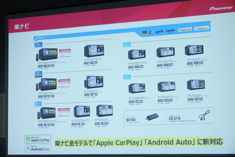 パイオニアは、「carrozzeria」ブランドで展開するカーナビ「楽ナビ」でAndroid Auto/Apple CarPlay対応モデルを5月に発売した。あわせてディスプレイオーディオでも新機種が発売されている。
