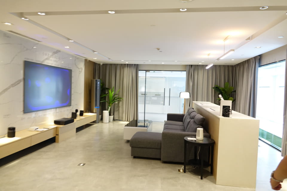 ストア2階には、リビングや寝室などをイメージしたショールームがあり、同社のスマートホーム製品を体験できる。ルームツアーは、ショールームの扉を開けた瞬間からスタートし、ユーザーが帰宅した、という想定でカーテンが自動で開いたり、空調が作動したり、ユーザーが何もしなくても環境が整えられるシミュレーションが体験できる。先述のようにさまざまな製品を展開している同社、エアコンや食器洗浄機、浄水器、温水便座のほか、電動歯ブラシなどの小型家電までラインアップされている。ショールームに展示されている同社製品は、その製品の特徴や価格も掲示されているので、ユーザーはより具体的にイメージできるようになっている。