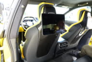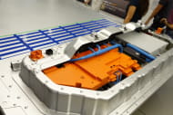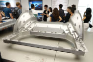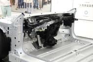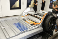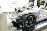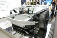 展示の中心には、同社の電気自動車の車台(シャーシ)が展示されており、同社の電気自動車への入れ込み具合がわかる。