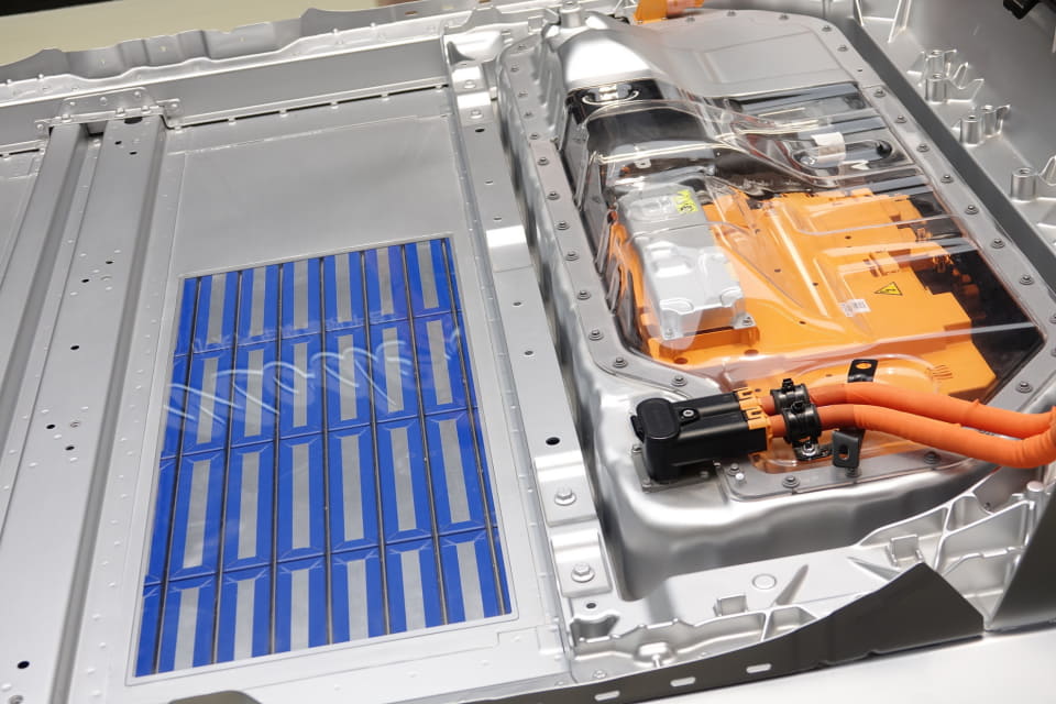 自動車のガソリンタンクとなる充電池のバッテリーセルは、車室の床にあたる部分に配置されている。合計190個のセルが床一面に配置されており、一体化されていることで厚さを薄くでき、車室の空間拡大が図られている。