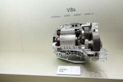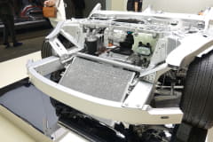 展示では、充電池の配置やモーターのスペック、車体で使われている素材などが解説されている。
