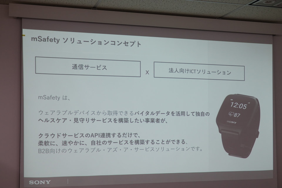 みまもりがじゅ丸に採用された「mSafety」は、ソニーネットワークコミュニケーションズが提供する法人向けソリューション。ヘルスケアや見守りサービスを展開する事業者が増加するなかで「市販デバイスではサービスに組み込みにくい」という声に応えた。スマートフォンとの連携設定などは必要なく、デバイスの取り扱いが容易などのメリットがある。