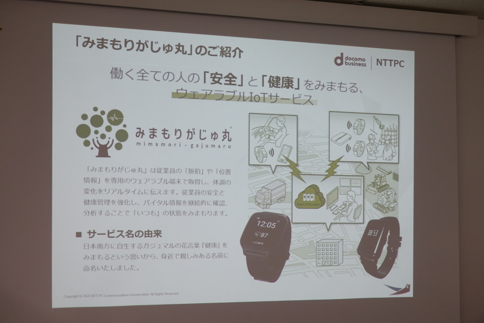 「みまもりがじゅ丸」は、ウェアラブルデバイスで心拍数などのデータをモニタリングして、熱中症や業務中における事故を防ぐサービス。いくつかのプランが提供されており、そのうちひとつはソニーネットワークコミュニケーションズのウェアラブルデバイスと通信などがセットのソリューション「mSafety」を利用したプランとなる。
