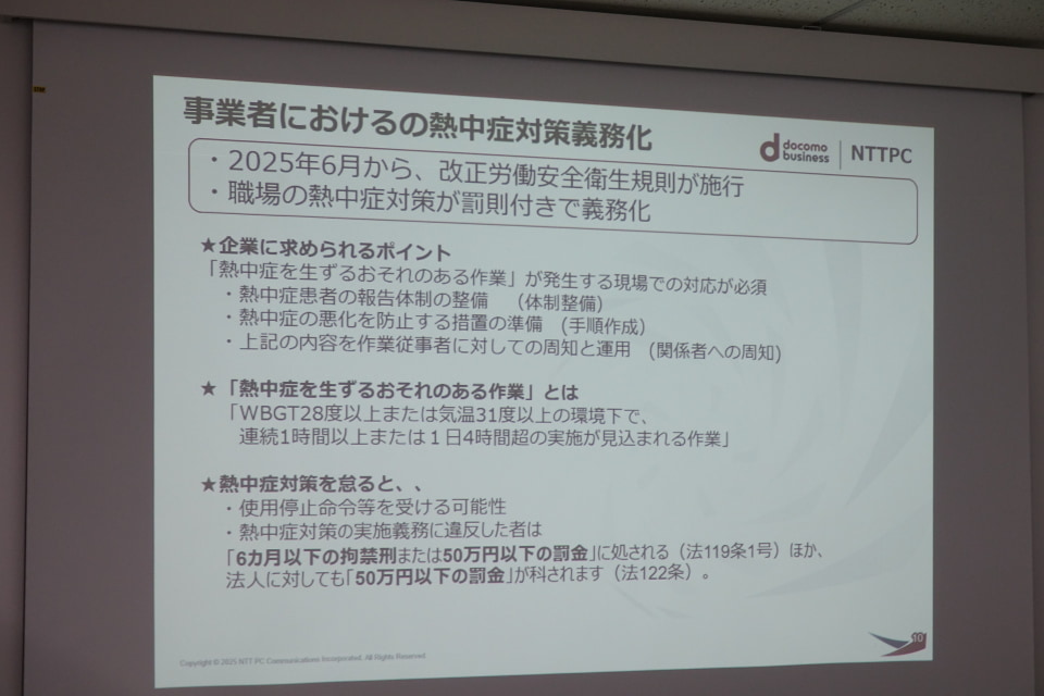 今月6月から施行された改正労働安全衛生規則では、熱中症の予防・重篤化を防ぐことを目的に、事業者に対して一定の環境で「体制整備」「手順作成」に加えて実際の作業従事者など「関係者への周知」が求められる。
