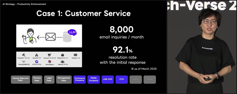 たとえば、カスタマーサポートではAIによる自動応答を導入し、主要サービスで92.1%の問い合わせが自動で完結。社内会議では多言語リアルタイム通訳ツール「Scout」を開発し、会議コストを約90%削減する効果が期待されている。