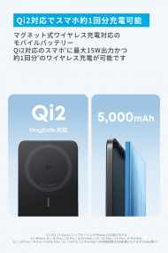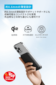 ワイヤレス充電規格の「Qi2」に対応。iPhoneにマグネットで装着し、ワイヤレスで充電することもできる。本体にはアルミ素材を使用し、従来モデルと比較して43%薄型化した。ワイヤレス充電での出力は最大15W。