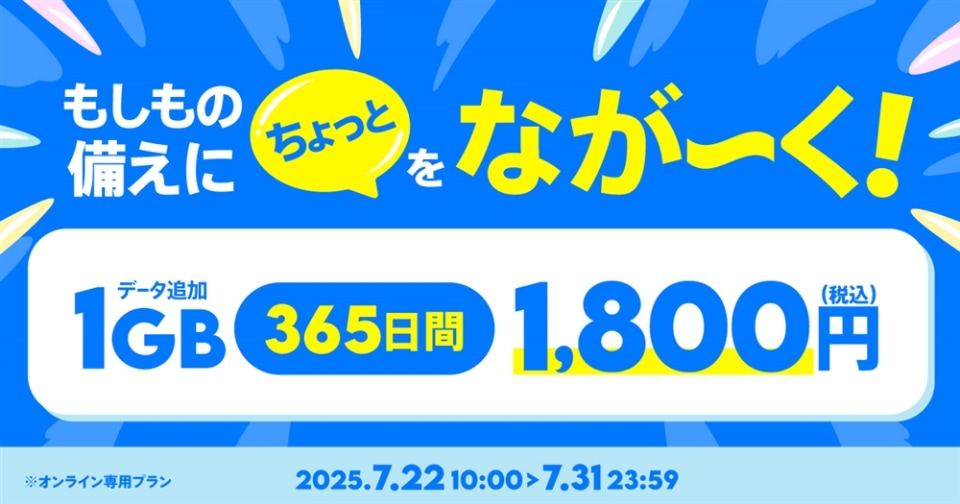 KDDIと沖縄セルラーは、オンライン専用料金ブランド「povo2.0」で、1GBというデータ通信量で有効期間が365日という「1GB(365日間)」を発売した。7月31日いっぱいまで販売され、利用料は1800円。