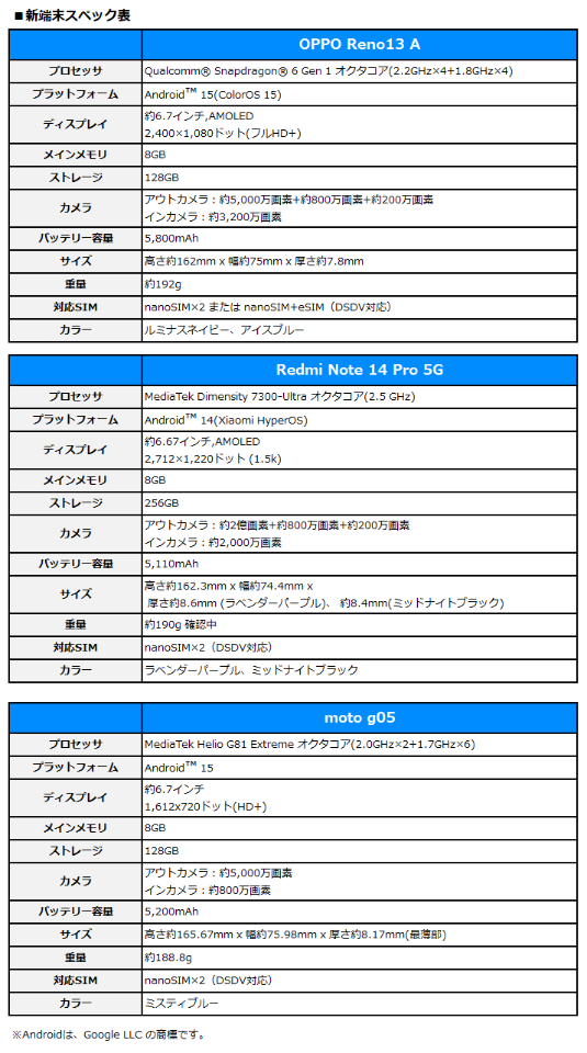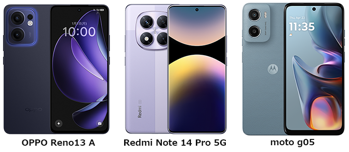 ラインアップに加わったのは、OPPO製の「OPPO Reno13 A」、シャオミ製の「Redmi Note 14 Pro 5G」、モトローラ製の「moto g05」の3機種。
