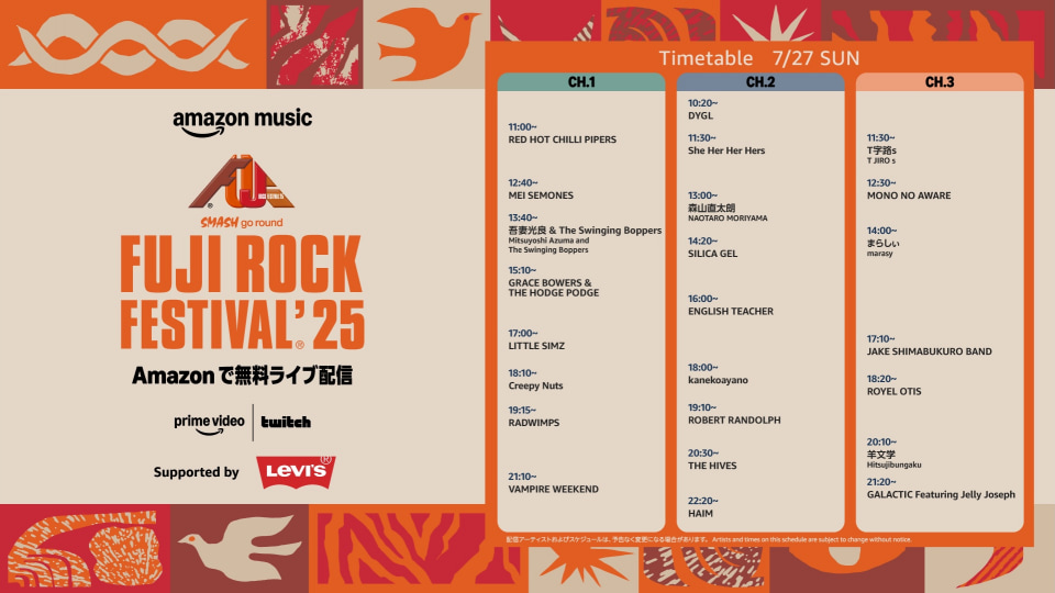 「FUJI ROCK FESTIVAL '25」は、7月25日~27日に開催される。Amazonプライムでの配信はチャンネル1~3に分けて用意される。なお、プライム会員でなくとも、Amazonアカウントがあれば視聴できる。