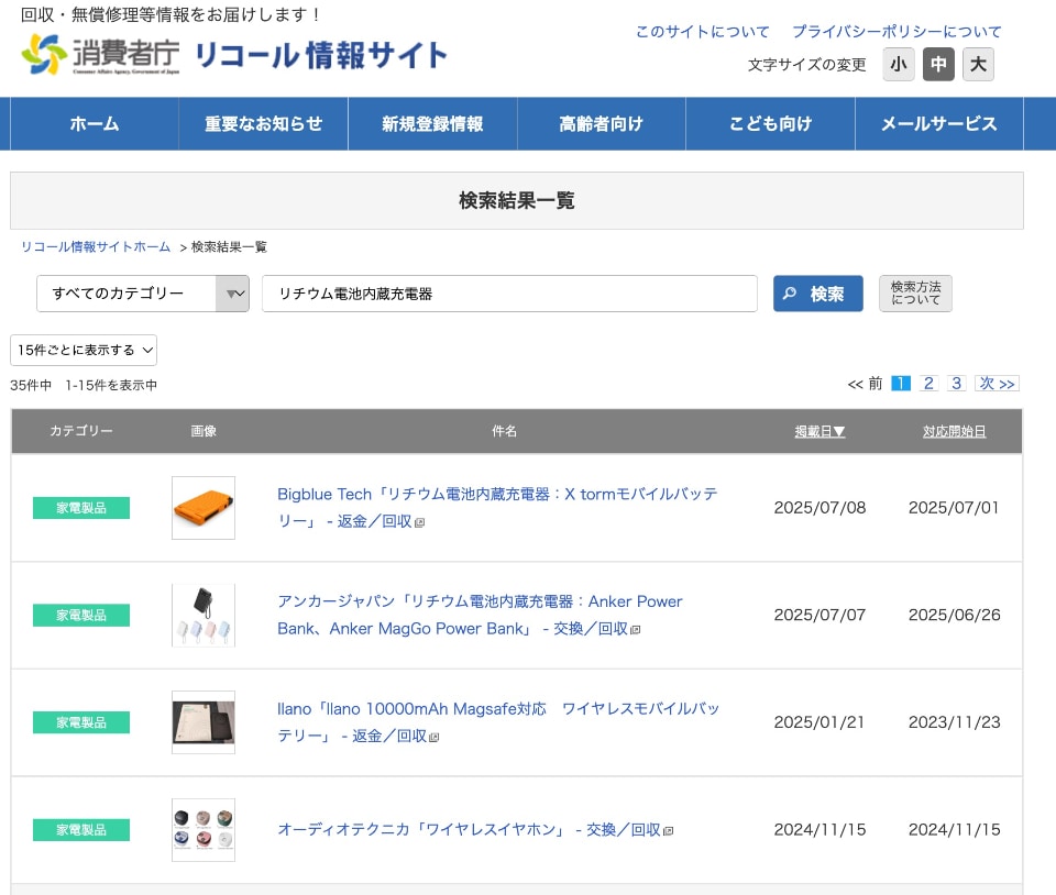 リコール対象商品の検索は、消費者庁の「リコール情報サイト」で「リチウム電池内蔵充電器」などと検索するとモバイルバッテリーなどが、商品のサムネイルつきで一覧表示され、対象となる商品を見つけやすい。