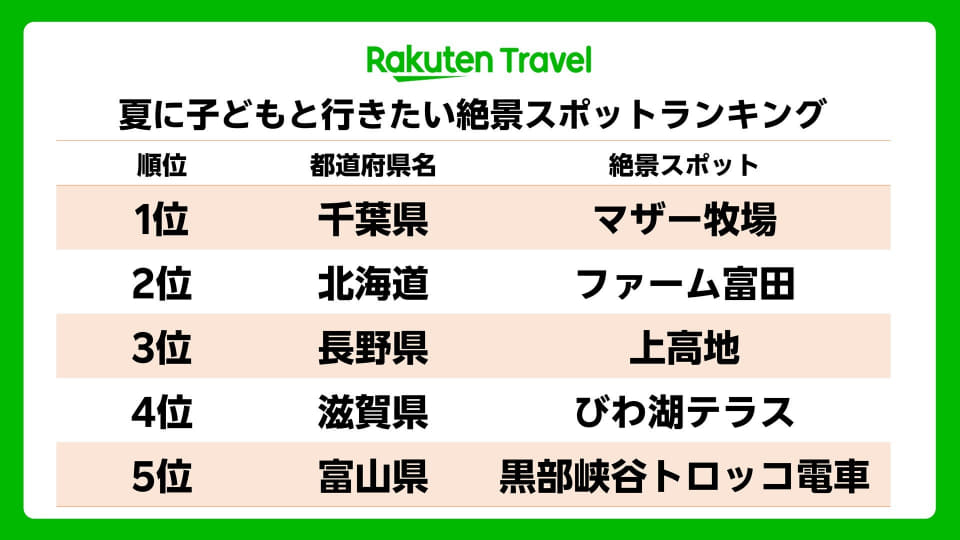 楽天グループは4日、運営する旅行予約サービス「楽天トラベル」において、「楽天ママ割」メンバーを対象に実施したアンケート調査から「楽天トラベル 夏に子どもと行きたい絶景スポットランキング」を発表した。