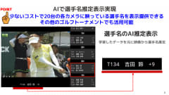 実証は、6月26日~29日にカメリアヒルズカントリークラブ(千葉県袖ケ浦市)で開催されたゴルフトーナメント「アース・モンダミンカップ2025」で実施。会場に合計20台の中継カメラを設置し、ユーザーは好きなカメラを選択して視聴できるマルチアングル中継で、それぞれのカメラにフレームインしている選手をAIが自動で判別し、現在のスコアなどの情報を画面に表示する。実証では、約72%の割合で正しい選手名を表示できた。