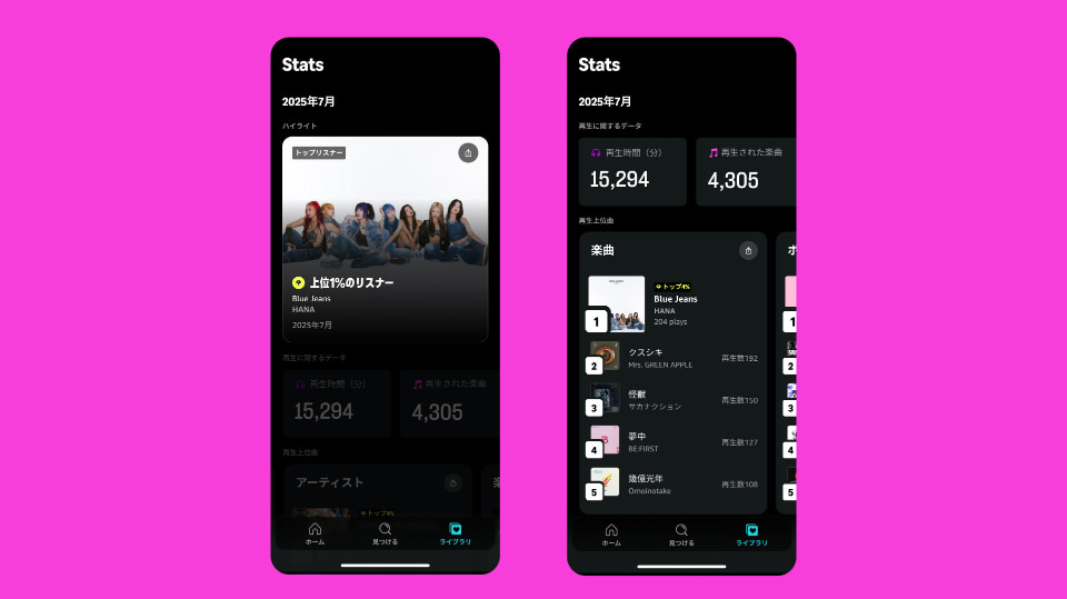 まずは1カ月単位でのデータをチェックできる。アーティスト、楽曲、ポッドキャストなどのデータをまとめ、月ごとにハイライトで示してくれる。たとえば「最も再生されたアーティスト・楽曲・ポッドキャスト」といったデータや、「楽曲とポッドキャストの再生時間(分)および楽曲、アーティスト、ポッドキャストエピソードの再生数」などがわかる。2025年後半には機能が拡充され、ユーザー自身で曲やアーティストの好みを、さらに把握しやすくなる。