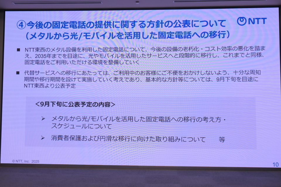 NTTの島田明社長は「メタル回線は、2035年に設備限界を迎える。それまでに計画的に代替サービスに移行を促したい。9月には(対象の)地名は発表しないが、まず移行の段取りを説明する」と話した。対象地域については、当初は光回線が充実している都市部から始めたい考えを示した。