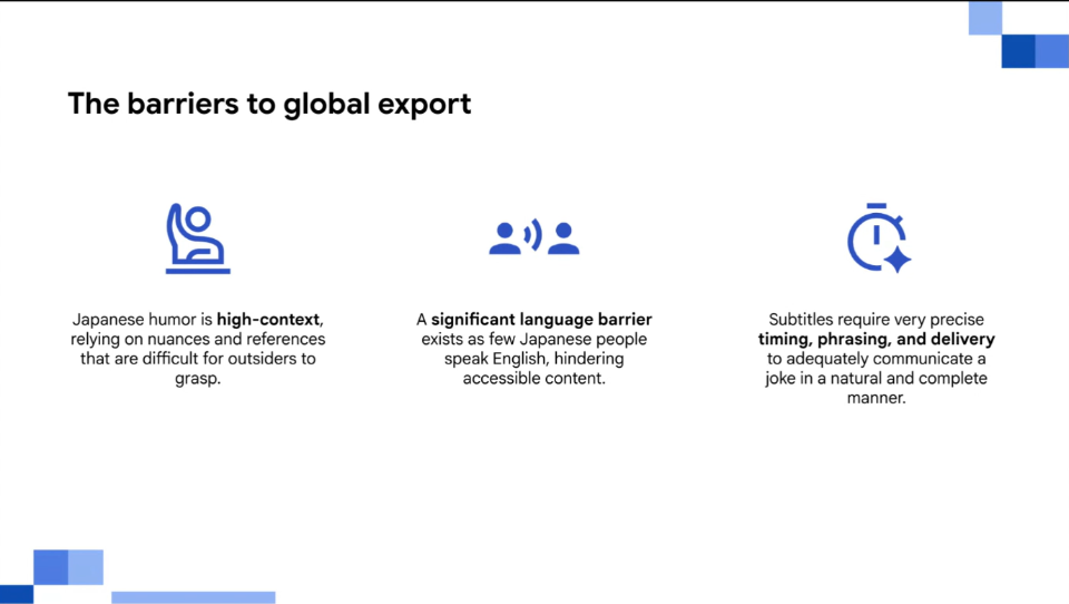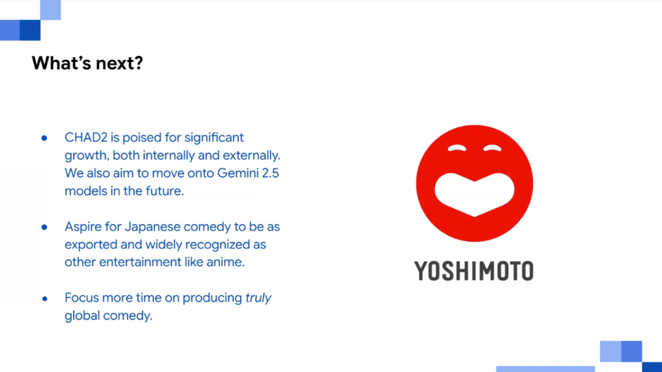 最後に紹介されたのは、吉本興業とグーグルが共同開発する字幕AI「CHAD 2」による、日本のコメディのグローバル展開に向けた取り組み。登壇した吉本興業のチャド・マレーン氏は、日本の「お笑い」はゲーム、アニメ、マンガに続くポップカルチャーの柱となり得るとしながらも、これまで日本語を前提とした展開が主だったため、海外ではその魅力が十分に伝わってこなかったと指摘した。